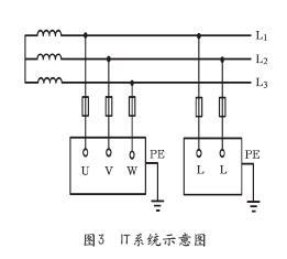IT系统就是电源中性点不接地、用电设备外露可导电部分直接接地的系统。IT系统又称为三相三线制系统。IT系统中,连接设备外露可导电部分和接地体的导线,就是PE线,如图3。