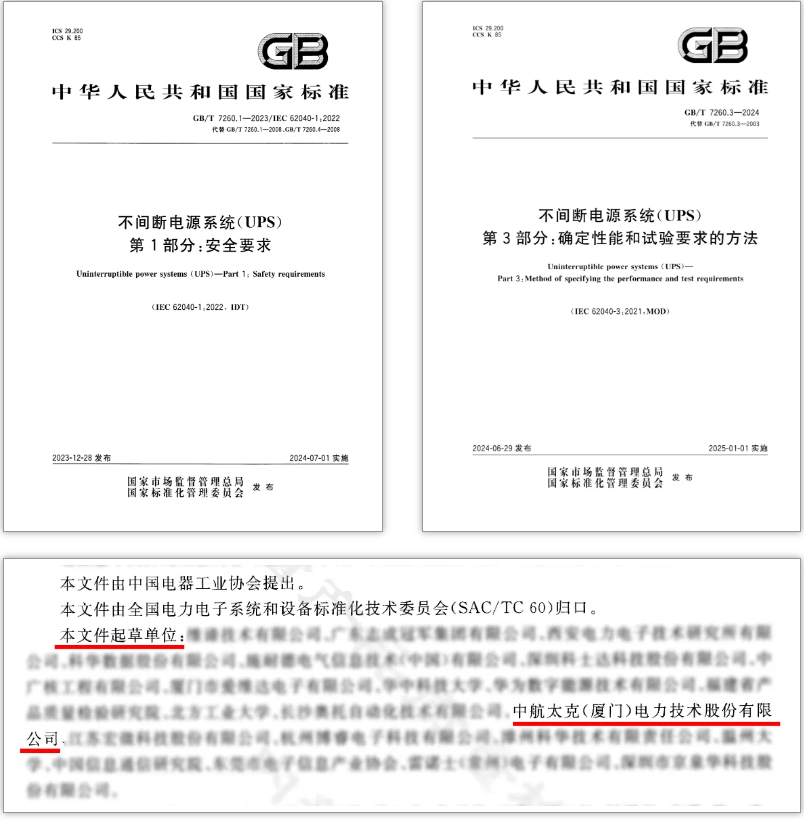 近期,国家市场监督管理总局、国家标准化管理委员会先后发布了《不间断电源系统(UPS)第1部分:安全要求》和《不间断电源系统(UPS)第3部分:确定性能和试验要求的方法》(以下统一简称“标准”)。作为新型数字电力能源系统解决方案制造商,中航太克凭借其在不间断电源系统(UPS)领域的深厚技术实力和丰富经验,参与了此次起草与修订工作,为标准的制定和完善做出了特殊贡献。