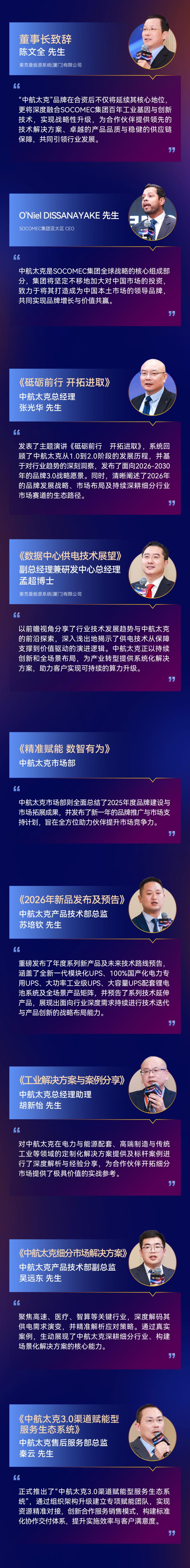 索克曼能源系统(厦门)有限公司董事长陈文全、SOCOMEC集团亚太区 CEO O'NEIL DISSANAYAKE、SOCOMEC集团大中华区总裁罗黎阳、索克曼能源系统(厦门)有限公司总经理 YVAN FABRE RINGBORG、太克电力技术(厦门)有限公司总经理张光华、索克曼能源系统(厦门)有限公司副总经理孟超博士、太克电力技术(厦门)有限公司总经理助理胡新怡等企业高层及全国核心渠道合作伙伴、行业专家等齐聚一堂,共话行业前景,共谋合作新篇。