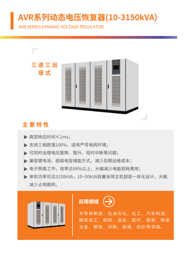 Voltage sag has become the most prominent problem affecting the stable operation of power load. AVIC Tec AVR series dynamic voltage restorer is "a good medicine", which perfectly solves the power quality problems such as voltage sag, voltage surge and short-term interruption for users.