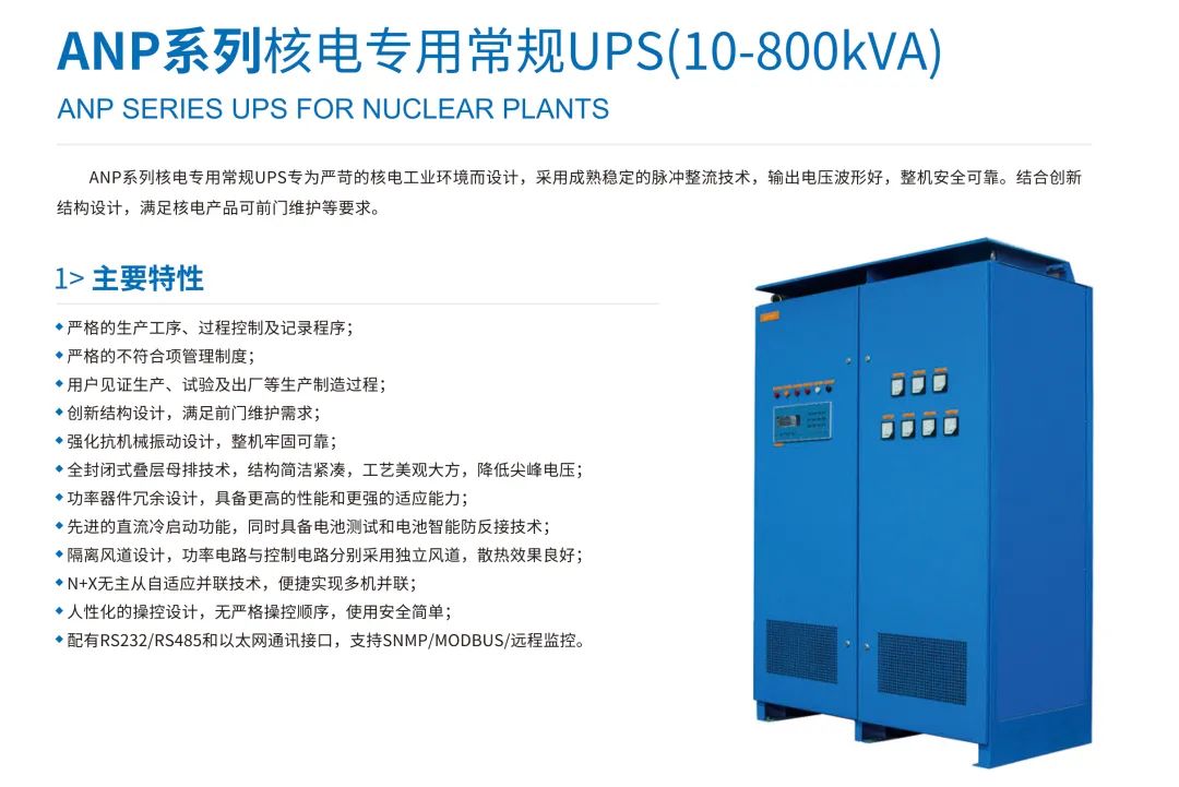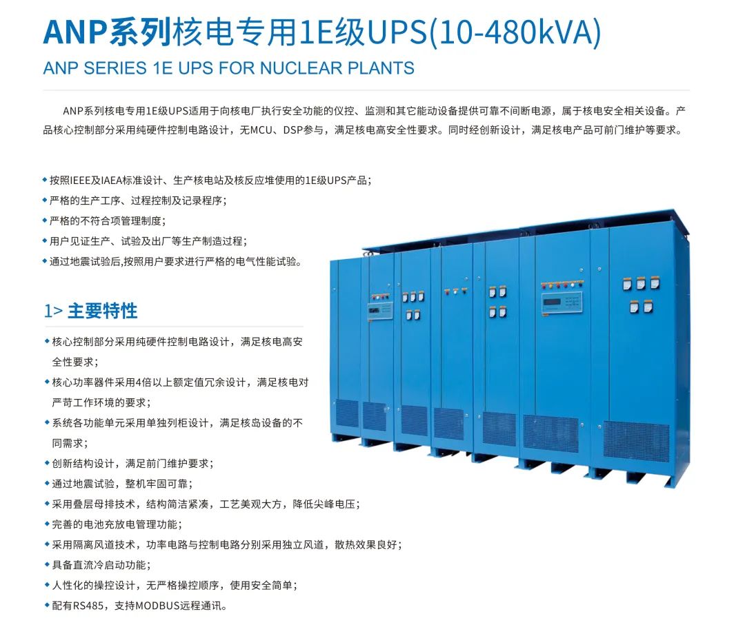 UPS power supply for nuclear power plants is recognized as the top equipment of the pyramid in the industry, which has higher requirements in terms of safety, reliability, maintainability and so on. In particular, class 1E (nuclear level) UPS power supply of nuclear power plants provides power supply guarantee for instrument control, monitoring and other active equipment of nuclear power plants that perform safety functions. The performance requirements are more stringent and need to be certified by the national nuclear safety administration.
