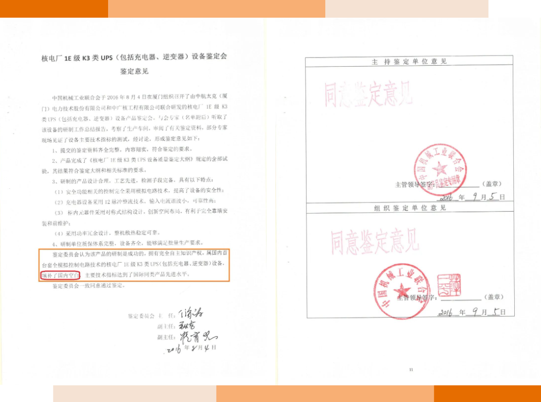 Our products have completely independent intellectual property rights. They are the first class 1E K3 UPS equipment for nuclear power plants with full analog control circuit technology in China, filling the domestic gap, and the main technical indicators have reached the advanced level of similar international products.